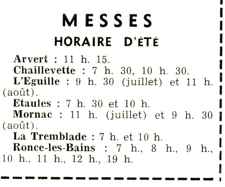 Horaires des messes dans la presqu'île d'Arvert en 1968.